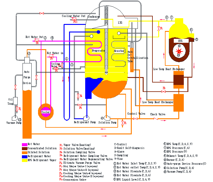 In the LTG, the high-pressure, high-temp refrigerant vapor from the HTG heats the dilute solution in the LTG and condenses into refrigerant water, which enters the condenser together with the refrigerant vapor generated in the LTG through throttling and depressurization, and then cooled into the refrigerant water corresponding to the condensing pressure by the cooling water in the condenser.
