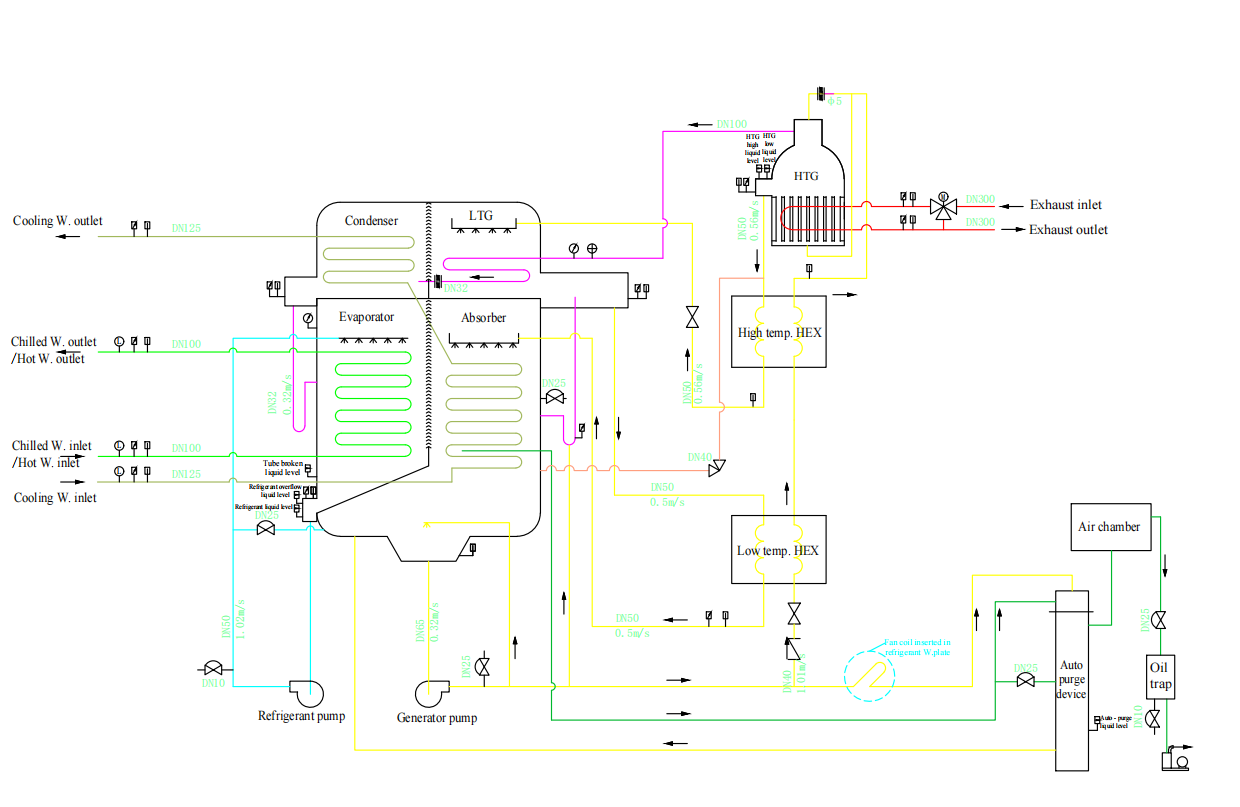 The exhaust Libr absorption chiller or we can call it as flue gas absorption chiller or heater, is a system, which uses the thermal energy of HT flue gas (300-600°C) to generate cooling or heating. The cycling working medium is the lithium bromide solution (LiBr). LiBr works as an absorbent and water works as refrigerant.