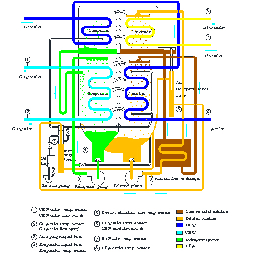 The refrigerant water in the evaporator evaporates from the surface of the heat exchanger tube. As heat is removed from the tube in the CHW, the temperature of the water is reduced and waste heat is recycled. The refrigerant vapour produced in the evaporator is absorbed by the concentrated solution in the absorber and the absorbed heat heats the hot water to a higher temperature. This is how the heating effect is achieved. The LiBr solution in the absorber then becomes a diluted solution, which is pumped to the heat exchanger by a solution pump. In the heat exchanger, the diluted solution is heated to a higher temperature and then transferred to the generator. At this point, the diluted LiBr solution in the generator is heated by the heat source and produces refrigerant vapour, which directly reheats the hot water in the condenser to a higher temperature. The diluted solution in the generator is concentrated into a concentrated solution which releases heat and cools in the heat exchanger. The concentrated solution is then sent to the absorber, where it absorbs refrigerant vapour from the evaporator and turns into a diluted solution. The next cycle by hot water absorption heat pump begins.