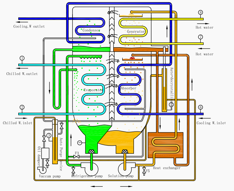 The process of absorbing refrigerant vapor inherently requires a low-pressure environment. By promptly removing the absorption heat, the cooling water prevents a pressure increase in the system due to temperature rise, thereby helping to maintain the necessary low-pressure environment in the absorber. This low-pressure environment, combined with the absorption capacity of the solution, creates a continuous driving force for the refrigerant vapor to flow from the evaporator to the absorber.